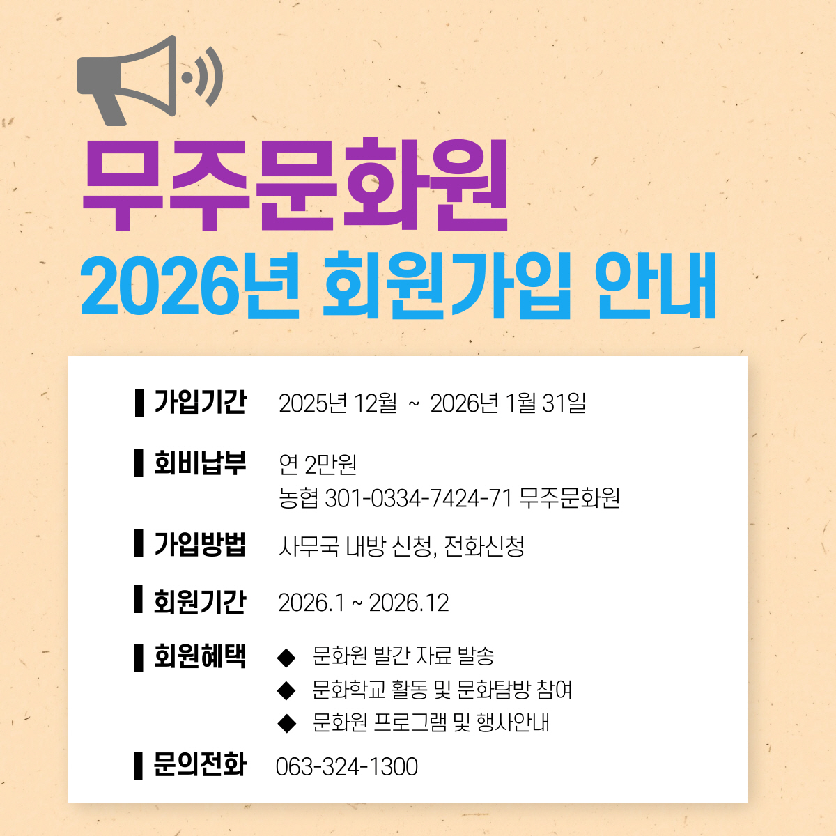 | 2026 무주문화원 회원가입 안내 무주문화원 2025-12-09 조회수 30 |
