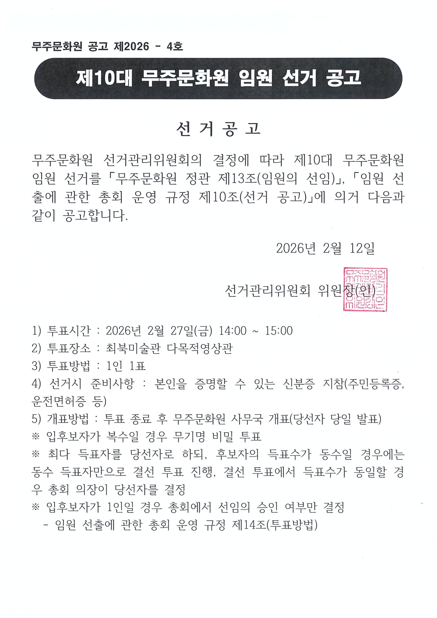| 제10대 무주문화원 임원 선거 공고 무주문화원 2026-02-12 조회수 53 |
