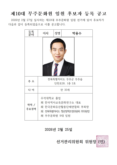 | 252 | 제10대 무주문화원 임원 후보자 등록 | 무주문화원 | 2026-02-25 | 58 |