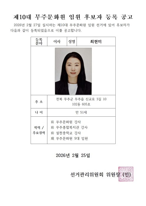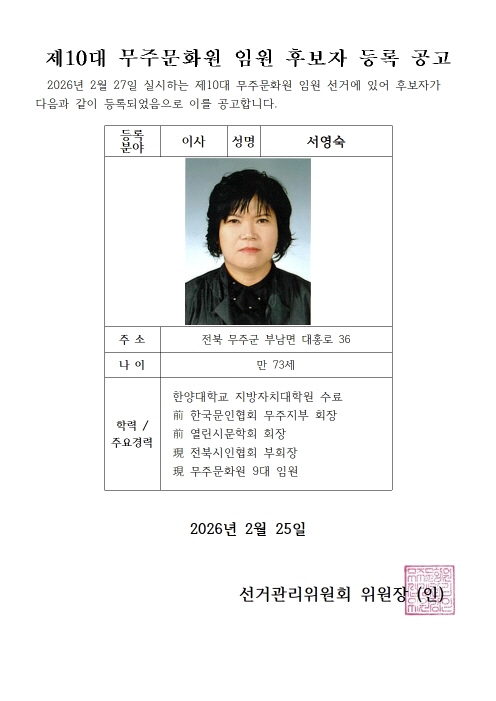 | 제10대 무주문화원 임원 후보자 등록 무주문화원 2026-02-25 조회수 57 |