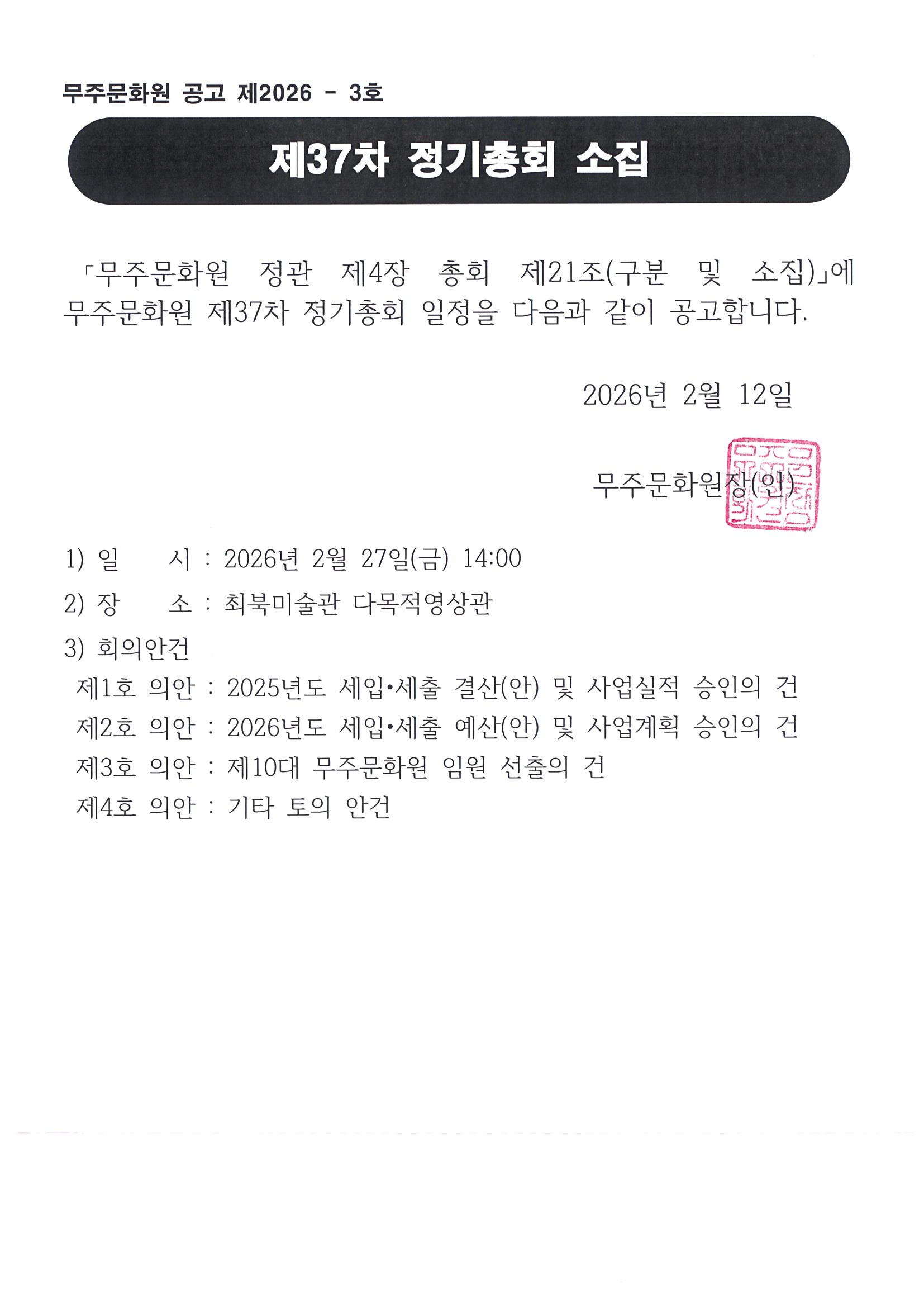 | 2026년 무주문화원 제37차 정기총회 개최 안내 무주문화원 2026-02-12 조회수 5 |