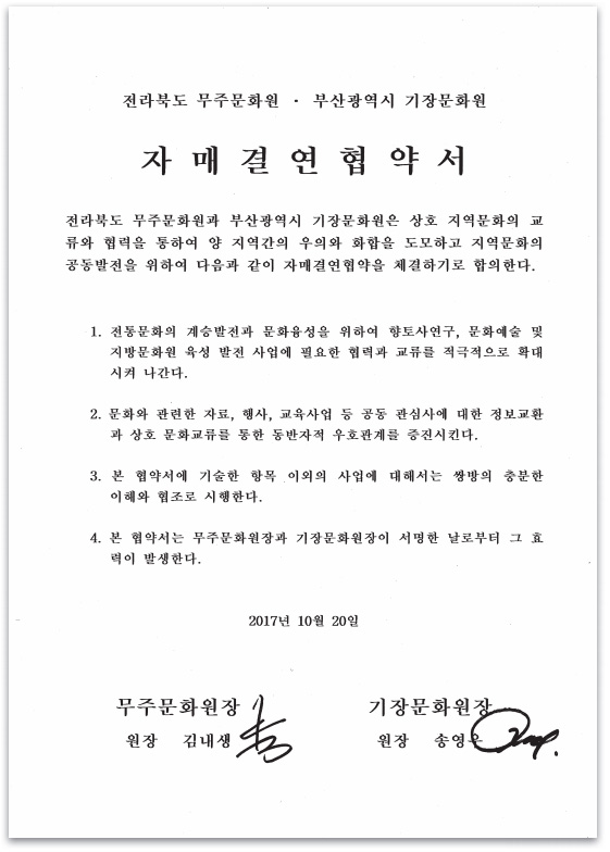 기장 문화원 송영우 원장이 무주를 방문하여 교류를 제안할 때에는 향후 몇 년간 교류를 진행한 뒤에 자매결연을 맺는 것으로 논의가 되었다가 무주군청의 제안으로 2017년에 자매결연이 추진되었다. 그리하여 2017년 10월 20일, 무주문화원 임직원이 기장군을 방문하여 향토사를 비롯하여 문화예술 공연 등 문화예술 전 분야에 걸친 정보 교환과 문화 교류를 통한 상호 이해와 협력을 도모하는 자매결연을 맺게 되었다.